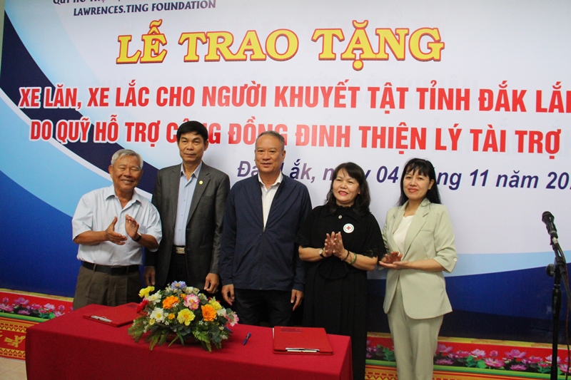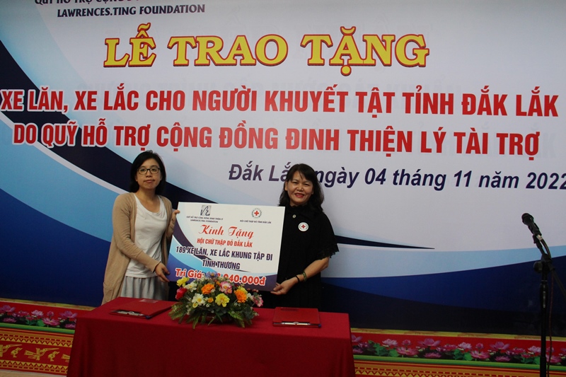 Nhà tài trợ trao biển tượng trưng giá trị xe lăn, xe lắc, khung tập đi cho Hội Chữ Thập đỏ tỉnh Đắk Lắk