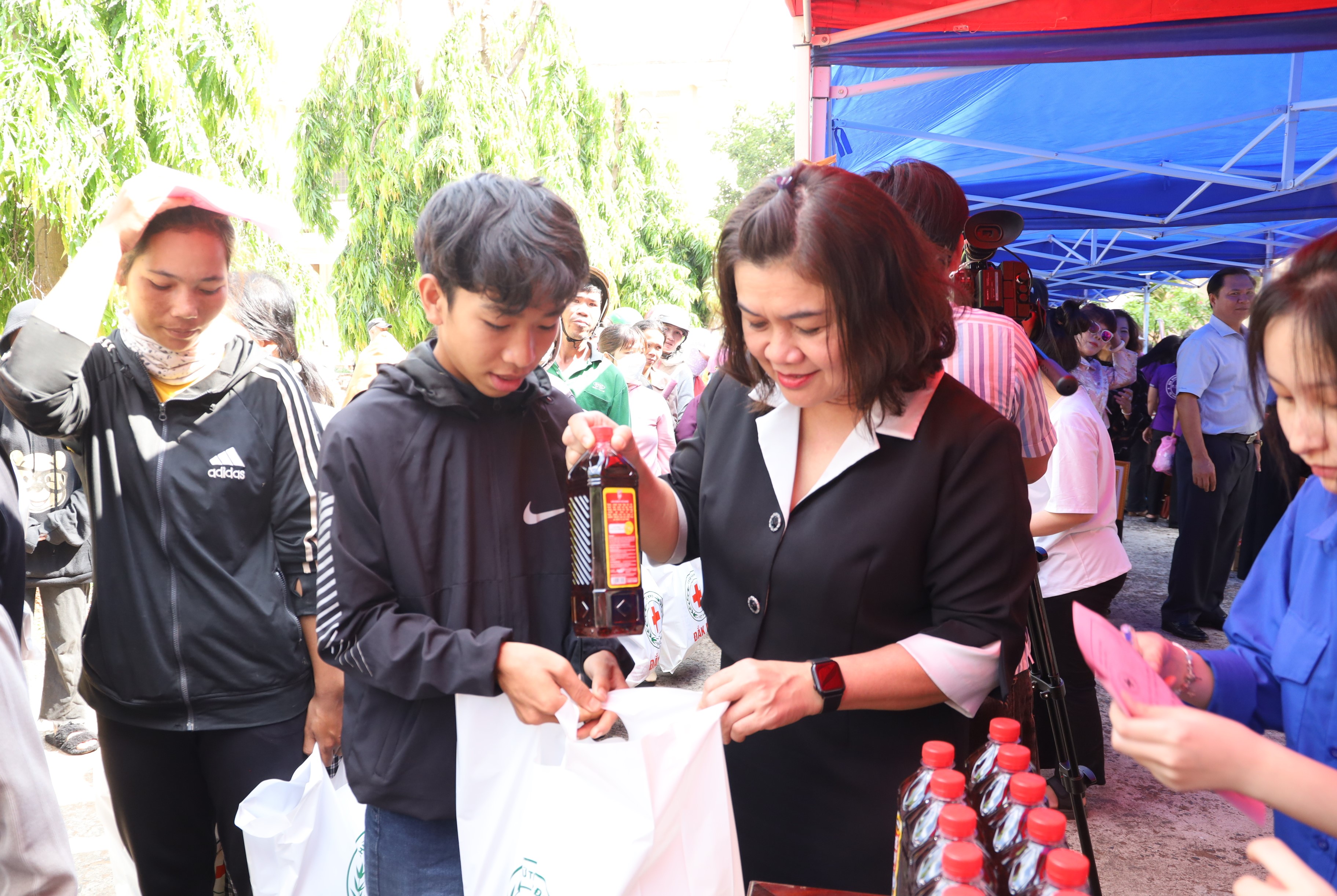 Phó Chủ tịch UBND tỉnh H’Yim Kđoh trao tặng các phần quà cho người dân tại phiên Chợ Nhân đạo.