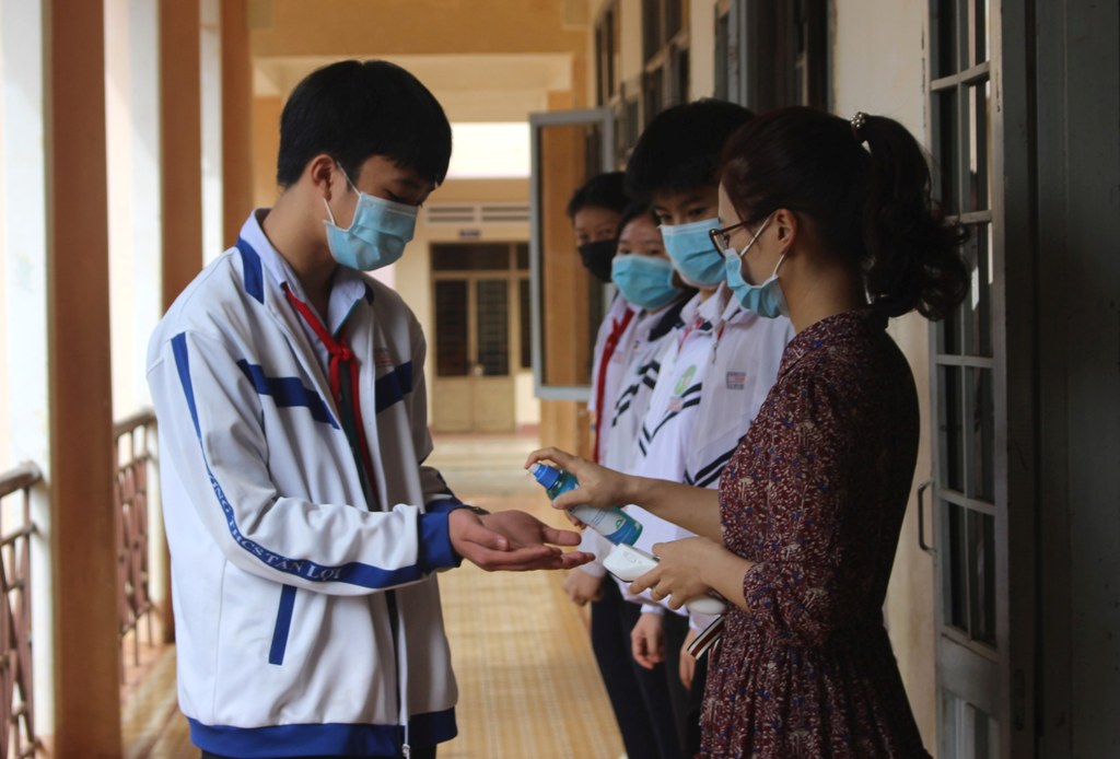 Học sinh vệ sinh tay bằng dung dịch sát khuẩn trước khi vào lớp